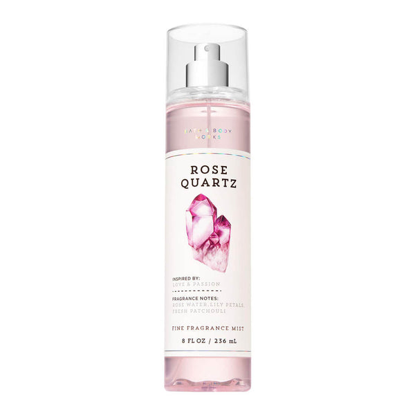 Bath & Body Works Rose Quartz Fragrance Mist is a lovely blend of rose water, lily petals & fresh patchouli. Inspired by love & passion! Lavishly splash or lightly spritz, either way you'll fall in love at first mist. Our carefully crafted bottle and sophisticated pump delivers great coverage while conditioning aloe mist nourishes skin for the lightest, most refreshing way to fragrance.